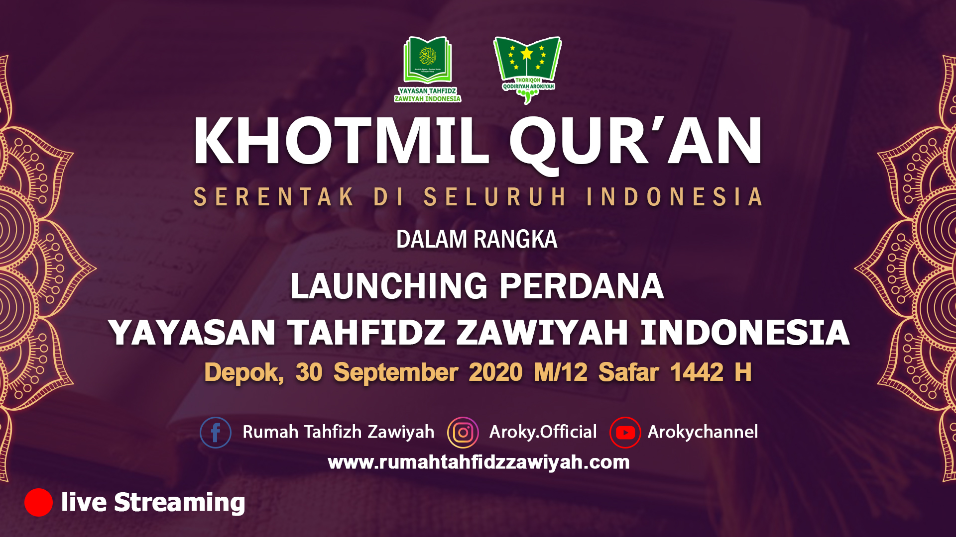 Yayasan Tahfiz Zawiyah Indonesia mengadakan acara Khatmil Qur’an Nasional via zoom, dalam rangka Launching Perdana Rumah Tahfiz Zawiyah Indonesia. Yang mana saat ini sudah berdiri 6 tempat rumah Tahfizd Zawiyah. Target pertengahan tahun 2021 bisa berdiri 100 Rumah Tahfiz Zawiyah.