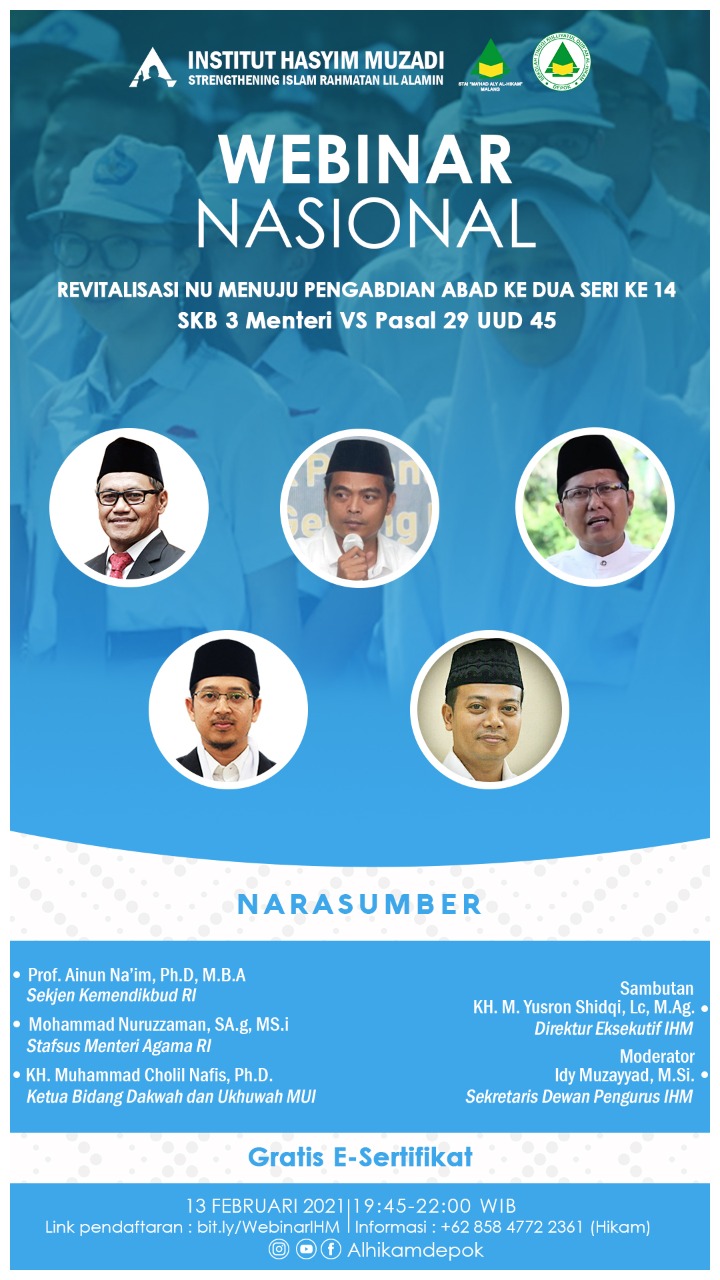 Walisongoonline.com, Depok | (Sabtu, 13/3/21) Institut Hasyim Muzadi menyelenggarakan Webinar Nasional Revitalisasi NU Menuju Pengabdian Abad ke Dua Seri ke 14 dengan topik “SKB 3 Menteri VS Pasal 29 UUD 45” pada Sabtu (13/02/2020). Webinar ini mempertemukan berbagai pemangku kebijakan terkait dikeluarkannya Surat Keputusan Bersama 3 Menteri yang berisi penggunaan pakaian seragam dan atribut di sekolah negeri mulai dari pendidikan dasar hingga menengah.